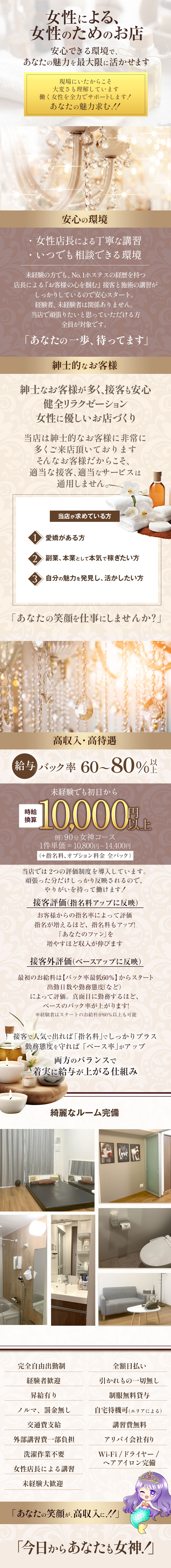 | 【お仕事内容】 | ご来店いただいたお客様に「アロマオイル」を使用したマッサージや指圧により、心身の疲れを解きほぐし癒しを提供するお仕事です。 風俗サービスは一切ございません! 講習も女性店長が直接お教えしますのでご安心ください。 |